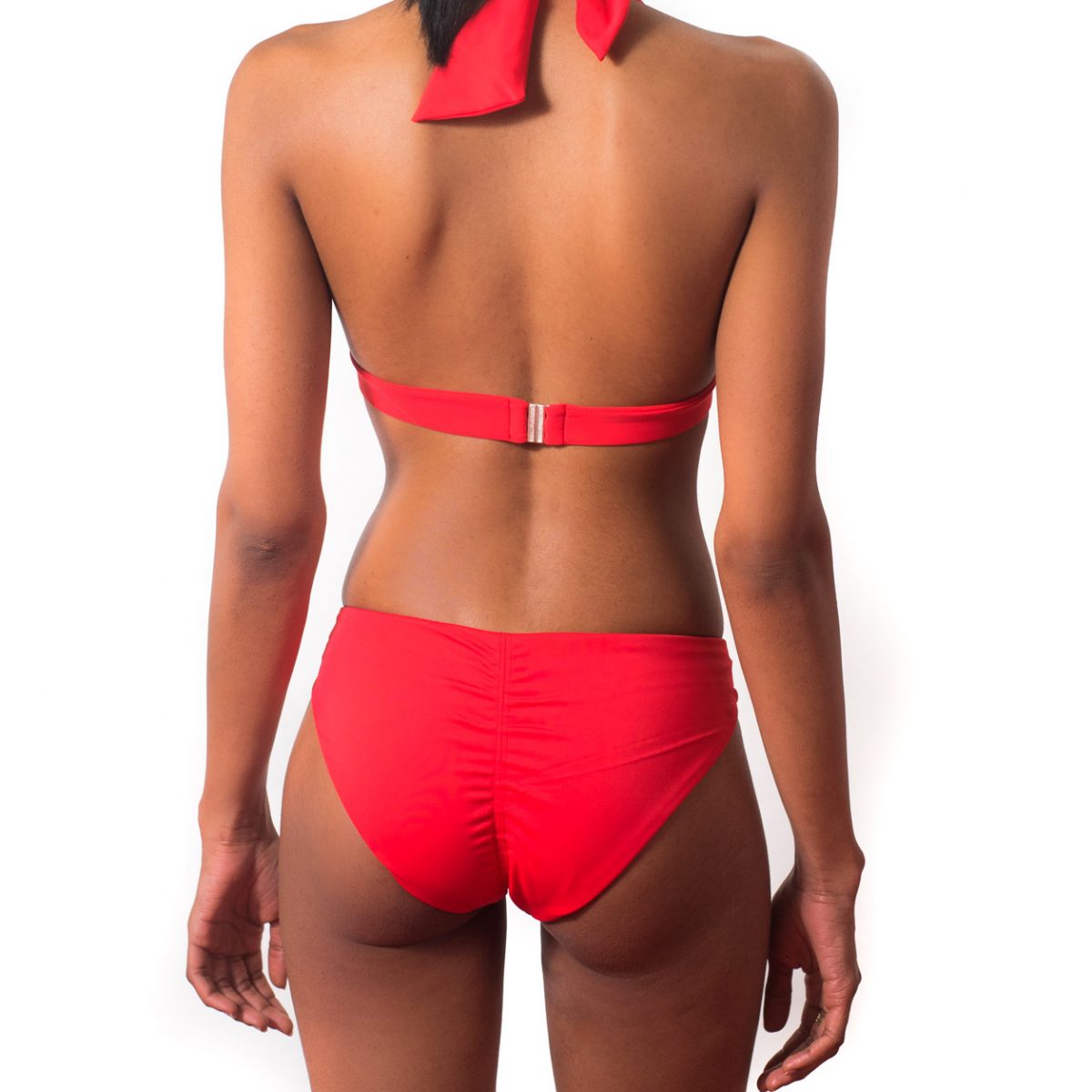 Este pequeño y sofisticado bikini de triángulo incluye pinzas en el busto y una banda ancha bajo el pecho. Sus correas para colgar se pueden atar alrededor del cuello o en la espalda. Este fondo colgante en la parte trasera ofrece un bonito redondeado al trasero.