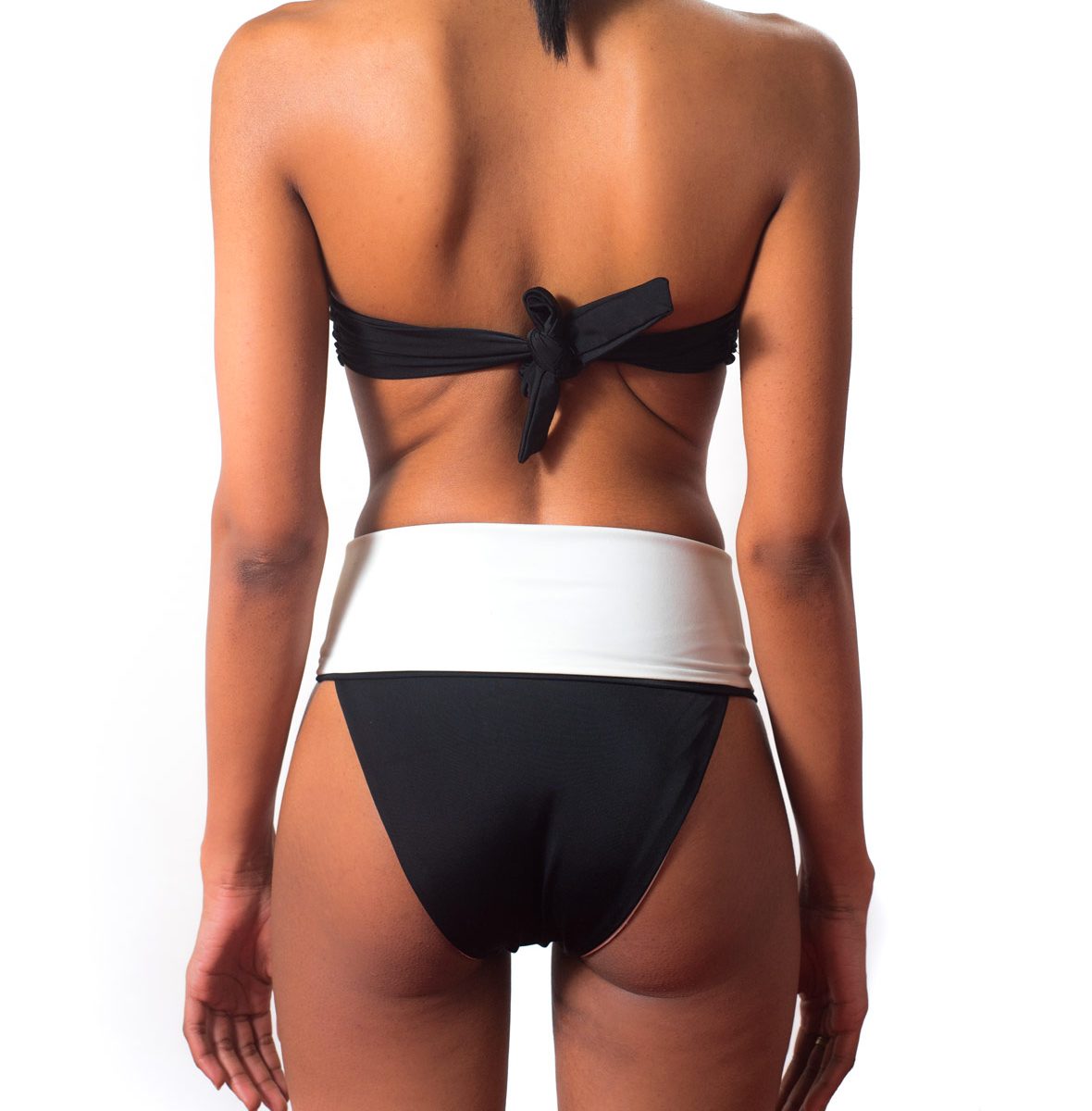 Un bikini bandeau tiene copas colgantes y de espuma sin aros, este estilo tiene pliegues a los lados y su fino tirante puede atarse al cuello o llevar sólo el bandeau. Esta braga de talle alto realza la cintura y se puede personalizar con un fondo reversible.