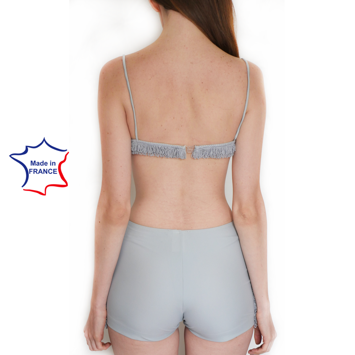 Ce short simple mais élégant est un tissu uni avec une coupe simple et de petites franges inversées de chaque côté donnant une finition très sophistiquée.