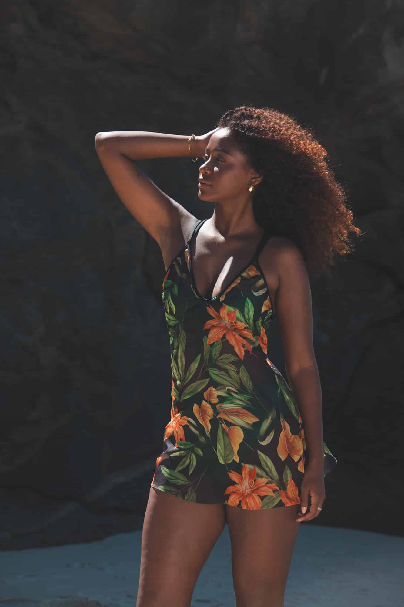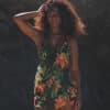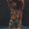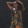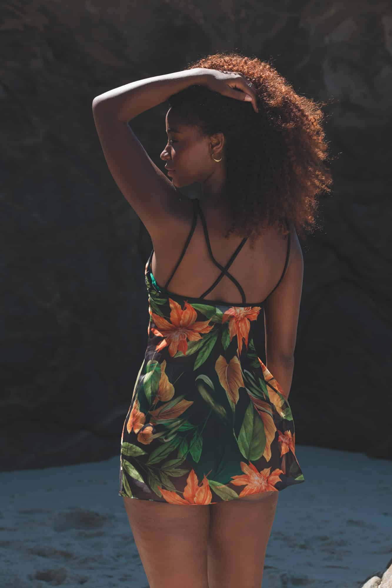 The Bloom Cover-Up features a bold orange floral print on a breathable black fabric with thin straps and a flattering V-neckline. Designed as a free-size piece, its relaxed A-line cut comfortably fits sizes 36 to 40 for an easy, pull-on beach look.